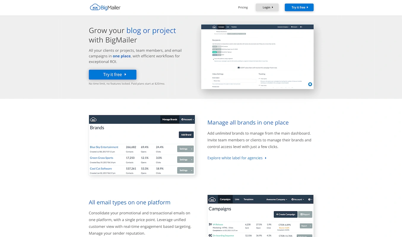 BigMailer is an email marketing platform designed for agencies to manage multiple brands, projects, and team members from a single dashboard. It consolidates promotional and transactional emails, offers customizable email templates, and automates data flows through integrations with various applications.